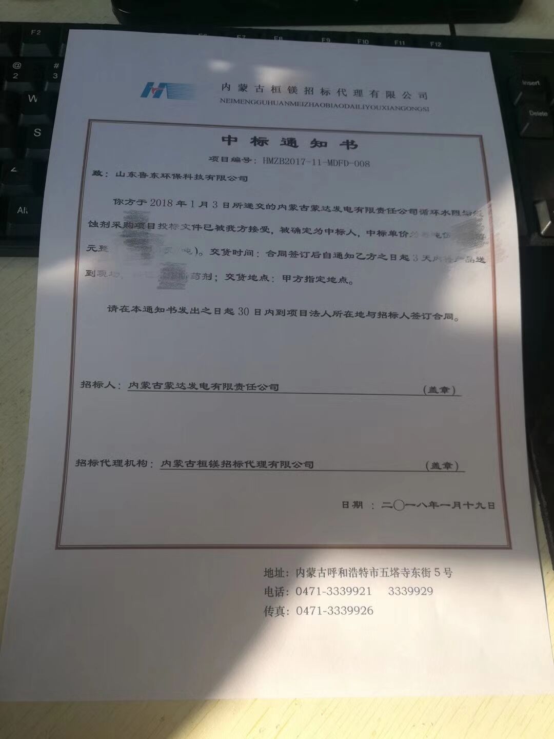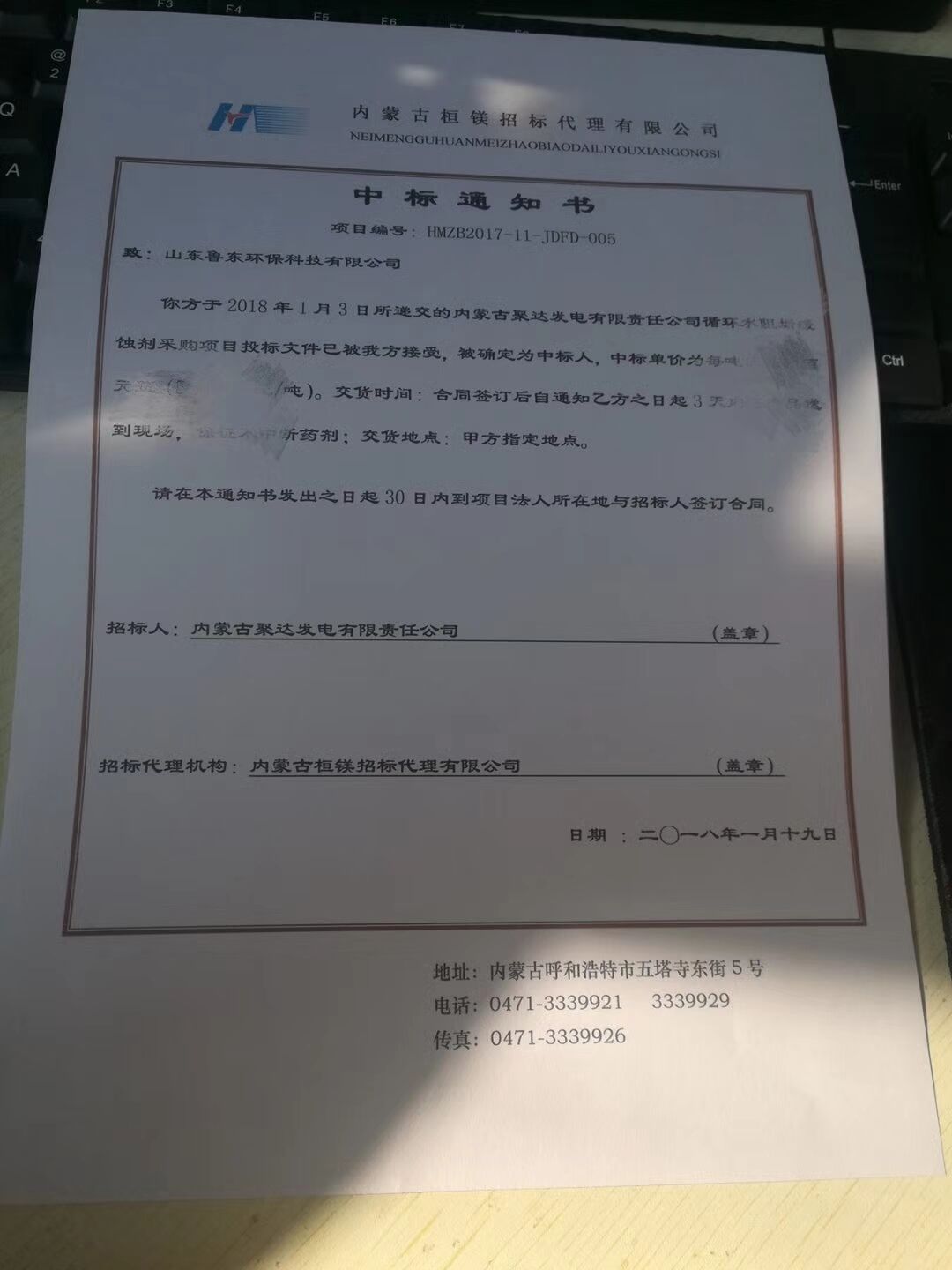2018年初,魯東公司佳績來襲,同時中標“內(nèi)蒙古聚達發(fā)電有限責任公司”“內(nèi)蒙古蒙達發(fā)電有限責任公司”水處理藥劑采購,